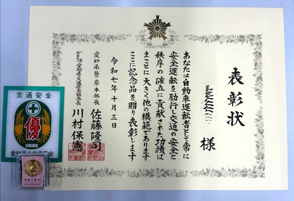 この度、弊社は「愛知県警察本部交通部」様および「自動車安全運転センター愛知県事務所」様の連名により、令和7年度『優秀安全運転事業所 銀賞』を受賞いたしました。