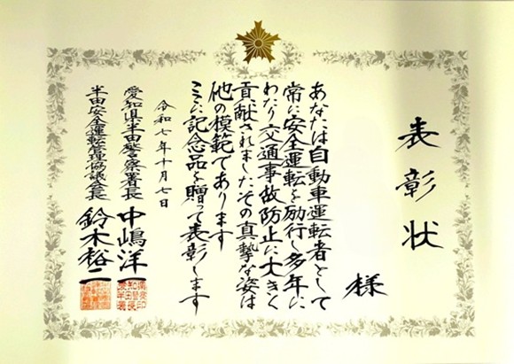 この度、弊社社員1名が愛知県半田警察署長様と半田安全運転管理協議会長様の連名により「優良自動車運転者(10年以上無事故・無違反)」として表彰を受けました。