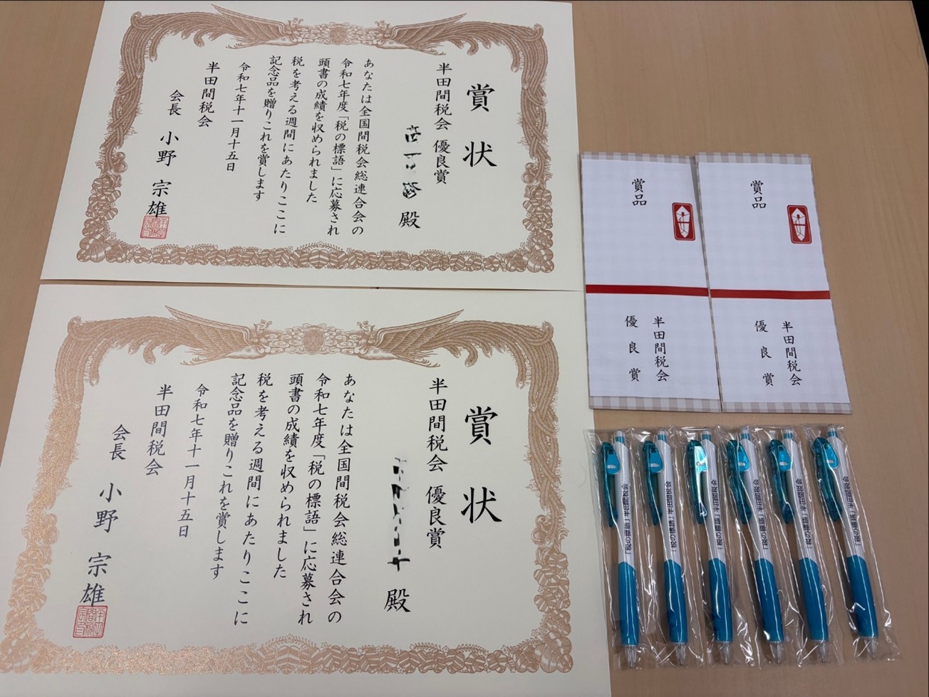 全国関税会総連合会の令和7年度「税の標語」に応募し、当社社員2名が「半田間税会 優良賞」を表彰されました。